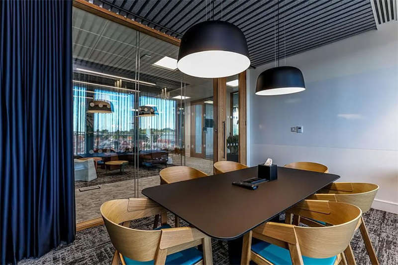 照明方案采用了多種光照的組合形式,以創(chuàng)建自然日光的感覺。對于技術部門來說,重要的是照明不能太高科技感或像一個大燈箱,因此這里使用了軌道照明代替漫射器和聚光燈。會議室以吊燈為主,突出與會人員的面部照明,以及屏幕上方用于遠程通話的燈光,因此,需要更專業(yè)的照明設計,以清晰、明亮的映襯和傳遞人物形象。