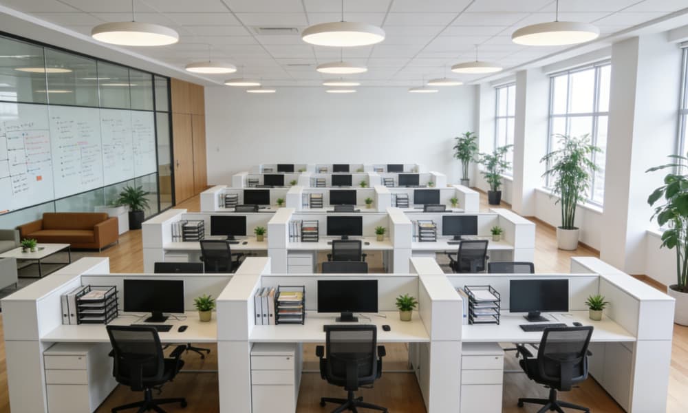 整體色調以白色、灰色為主,搭配少量黑色線條作為點綴,營造出簡潔大氣的視覺效果。材料運用上,注重質感與耐用性,采用玻璃、金屬、石材等現(xiàn)代材質,彰顯工業(yè)場所的專業(yè)性與品質感。在空間設計中,強調開放性與通透感,讓自然光線充分滲透,提高空間的舒適度與工作效率。