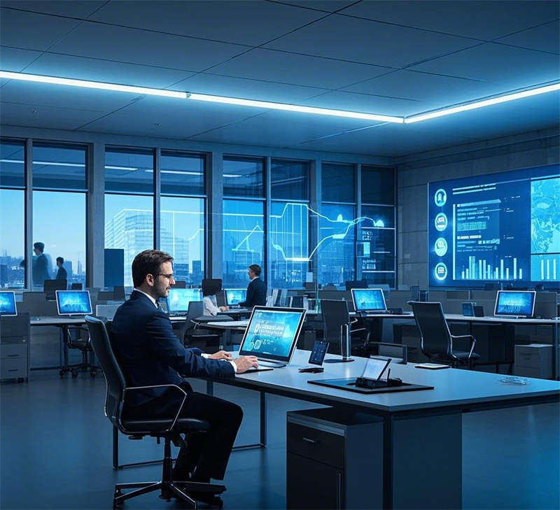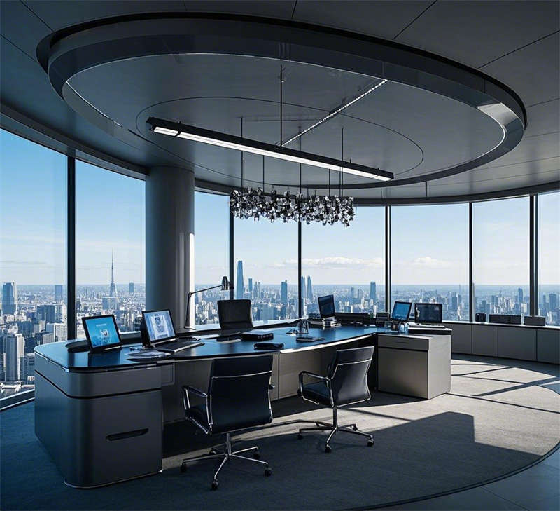 前臺接待室以懸浮式前臺和全息投影動態(tài)logo為核心,金屬質(zhì)感墻面與燈光效果結(jié)合,營造出未來之門的第一印象。敞開式辦公室通過數(shù)據(jù)流全息屏幕和智能辦公桌,打造高效協(xié)作的數(shù)字化辦公環(huán)境。經(jīng)理辦公室采用全景落地窗和智能辦公系統(tǒng),簡約大氣,兼顧商務與舒適。總裁辦公室位于頂層,全景視野與奢華材質(zhì)相得益彰,藝術(shù)裝置彰顯領導風范。