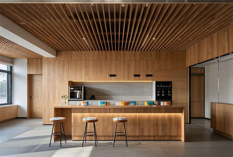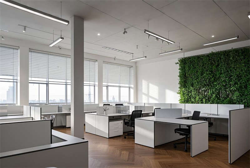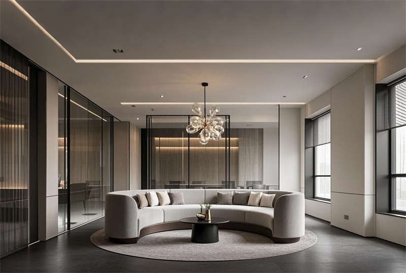 本方案采用現(xiàn)代簡(jiǎn)約設(shè)計(jì)語(yǔ)言,整體空間以淺灰、白、原木三色為主基調(diào)。前臺(tái)區(qū)設(shè)置懸浮式接待臺(tái)與發(fā)光LOGO墻,搭配LED線性照明塑造企業(yè)形象。開放式辦公區(qū)采用模塊化工位布局,通過玻璃隔斷劃分功能區(qū)域,保證自然采光最大化的同時(shí)提升空間通透感。智能會(huì)議系統(tǒng)集成于各會(huì)議室,配備電動(dòng)投影和書寫玻璃墻。經(jīng)理室采用深藍(lán)色烤漆木飾面提升商務(wù)質(zhì)感,休息區(qū)設(shè)置咖啡吧與卡座強(qiáng)化員工關(guān)懷。走廊運(yùn)用導(dǎo)視燈帶串聯(lián)各區(qū)域,茶水間六角地磚增添趣味性。培訓(xùn)室階梯式布局配合吸音墻面確保聲學(xué)效果,電話間磨砂玻璃立方體兼顧隱私與采光。VIP室智能霧化玻璃實(shí)現(xiàn)空間靈活轉(zhuǎn)換,整體設(shè)計(jì)注重功能分區(qū)與人文關(guān)懷的平衡。