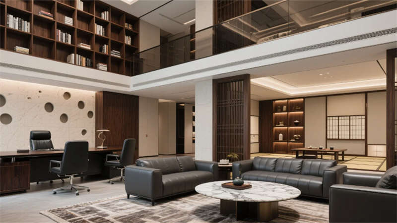 高管辦公區(qū)通過灰玻與豎向木紋鋁材構(gòu)筑半私密空間,L型胡桃木辦公桌與深棕真皮座椅彰顯商務(wù)質(zhì)感,獨立閱讀角的落地燈營造人文氛圍??偛棉k公室運用懸浮式書架墻與黑檀木辦公桌塑造權(quán)威感,環(huán)形皮革沙發(fā)組與天然大理石茶幾構(gòu)成高端會客場景,日式茶室通過木格柵與洞石墻面實現(xiàn)東西方美學交融。