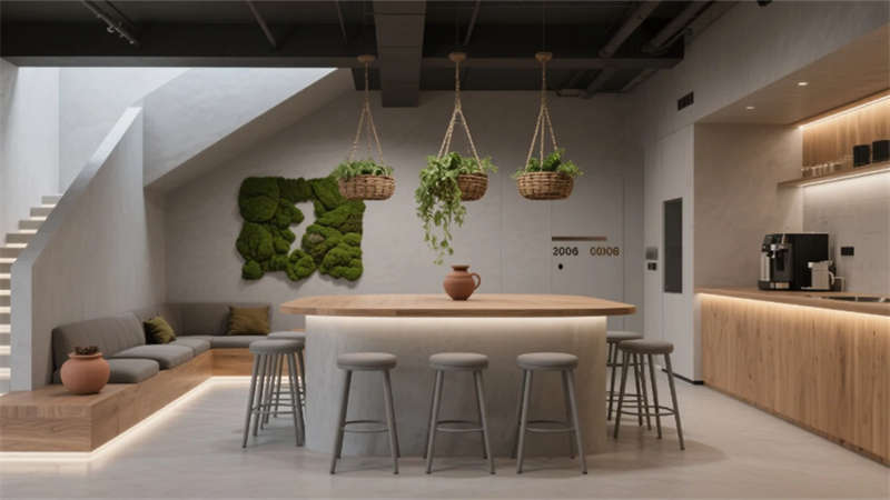 該設(shè)計(jì)以“自然共生”為脈絡(luò),將綠植生態(tài)系統(tǒng)與現(xiàn)代辦公需求深度融合。入口處以苔蘚藝術(shù)臺(tái)與流水光墻奠定基調(diào),流動(dòng)的綠意從呼吸幕墻延伸至開放辦公區(qū),原木桌面在漫射天光中模糊室內(nèi)外界限。獨(dú)立辦公室的垂直森林墻與靜音艙的苔蘚隔斷,在私密空間延續(xù)生態(tài)語(yǔ)言。