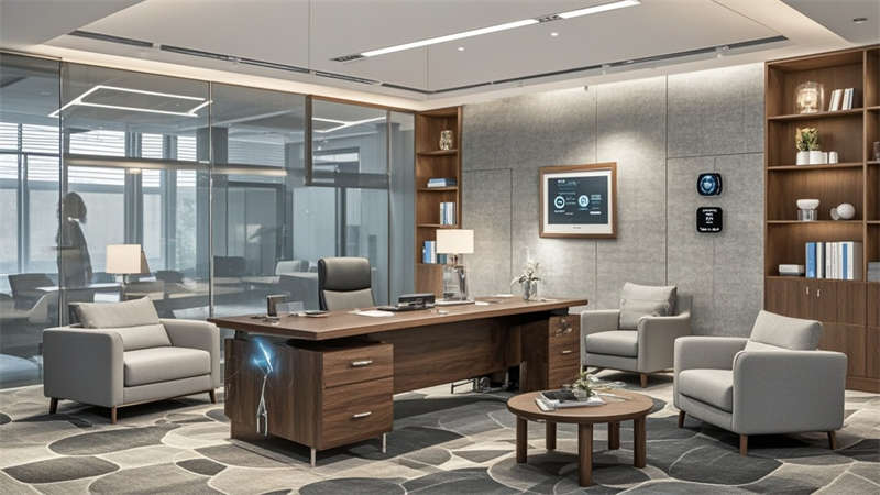 ④聲學(xué)吊頂確保35分貝以下靜音環(huán)境。色彩搭配采用70%淺灰奠定基調(diào),20%原木色增添溫暖,10%企業(yè)藍(lán)作為點(diǎn)睛色。環(huán)保方面選用LEED認(rèn)證材料,集成光伏玻璃幕墻年發(fā)電量達(dá)8萬度。