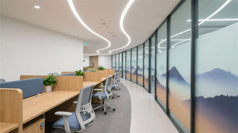 階梯式沙龍區(qū)打破傳統(tǒng)會(huì)議格局,弧形看臺(tái)激發(fā)平等交流,全息投影讓思維可視生長(zhǎng)。茶水間垂直花園與咖啡香氣交織,成為非正式碰撞火花的土壤。獨(dú)立辦公區(qū)低隔斷設(shè)計(jì)延續(xù)視野通透,曲線燈帶如枝蔓延伸,提示著人與空間的有機(jī)聯(lián)結(jié)。