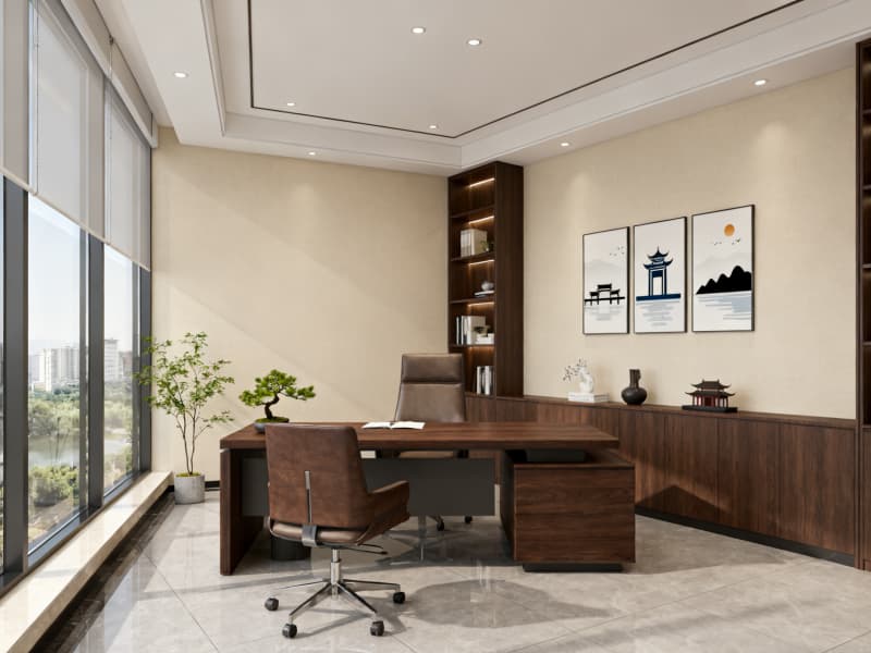 本設(shè)計(jì)以滿足辦公功能需求為核心,融合現(xiàn)代簡(jiǎn)約風(fēng)格與蚌埠地域文化元素,打造兼具實(shí)用性與美觀性的辦公空間。整體空間色彩以淺色系為主,搭配深色點(diǎn)綴,營(yíng)造清爽、舒適的視覺(jué)效果,同時(shí)通過(guò)落地玻璃窗、線性吊燈等設(shè)計(jì)引入充足光線,減少空間壓抑感。?