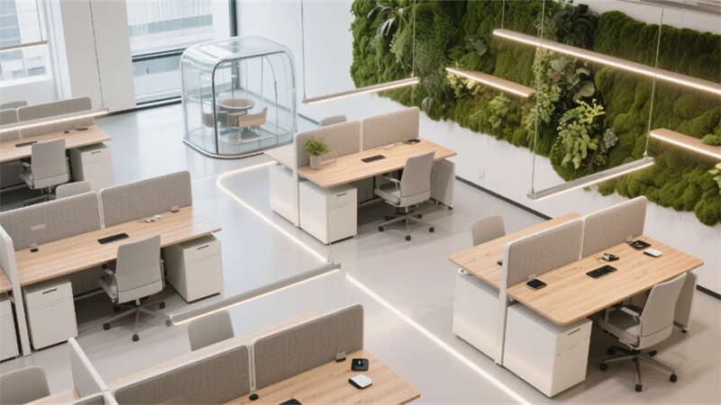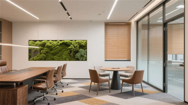 生態(tài)科技體系覆蓋全場景:經(jīng)理辦公室苔蘚墻集成空氣監(jiān)測系統(tǒng),總裁室霧化玻璃聯(lián)動光伏發(fā)電,小會議室綠植墻搭載微滴灌節(jié)水裝置。材質(zhì)選用安徽本土元素升級再造,大廳水磨石摻入大別山礦石粉,定制地毯紋樣提取徽派窗欞數(shù)字化變體。