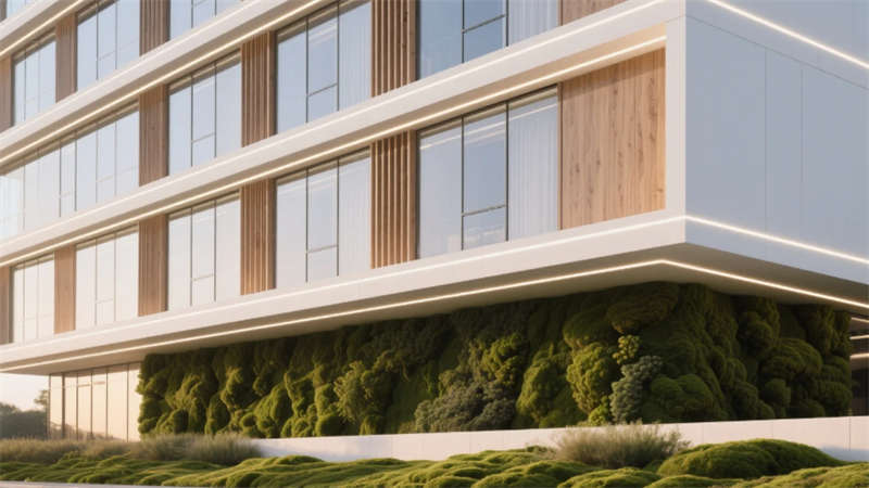 本案立足合肥科技創(chuàng)新城定位,以“自然滲透科技”為核心策略,打造7000㎡智慧辦公綜合體。外立面通過雙層呼吸式幕墻與垂直木紋格柵交織,形成動態(tài)光影濾網(wǎng),底部苔蘚景觀帶同步凈化PM2.5,實(shí)現(xiàn)建筑與巢湖生態(tài)區(qū)氣候的有機(jī)對話。