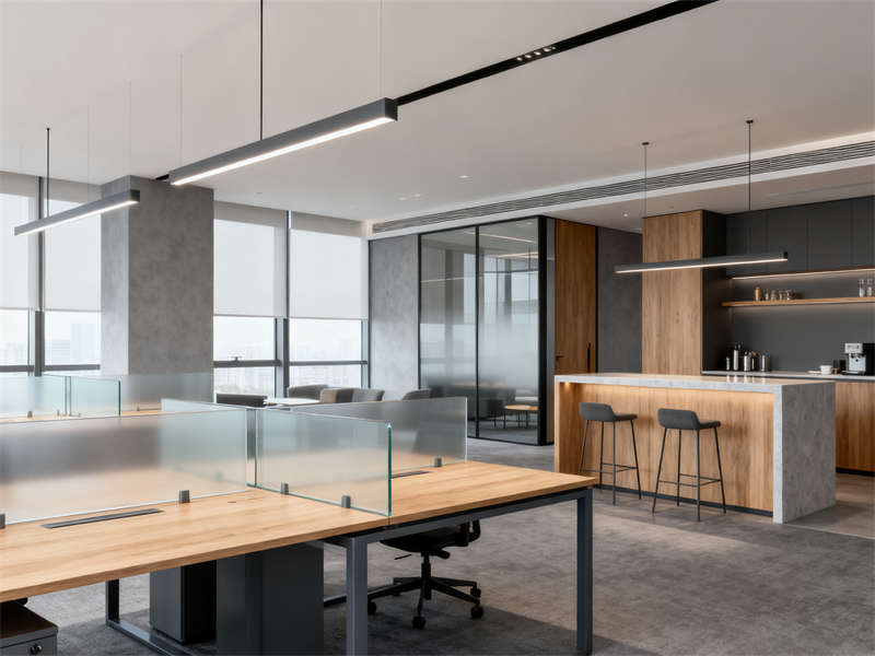 開放辦公區(qū)以通透協(xié)作為設(shè)計重點(diǎn),半透明磨砂玻璃隔板兼顧隱私與互動,木色桌面與深灰金屬支架結(jié)合,延續(xù)整體材質(zhì)基調(diào),搭配簡約照明,營造專注且不壓抑的工作氛圍。獨(dú)立辦公室劃分出辦公與接待區(qū)域,木飾面背景墻搭配淺灰布藝沙發(fā),在保持商務(wù)感的同時,增添柔和質(zhì)感,滿足私密溝通需求。