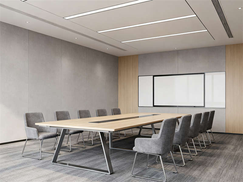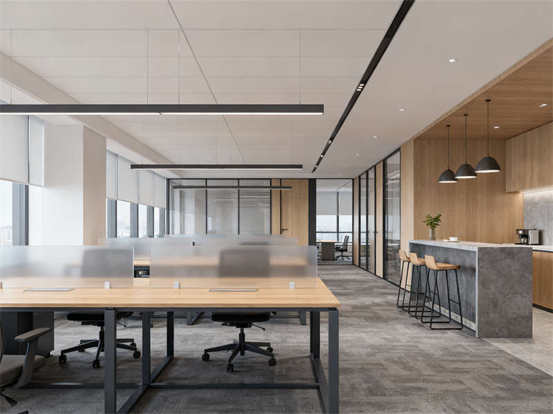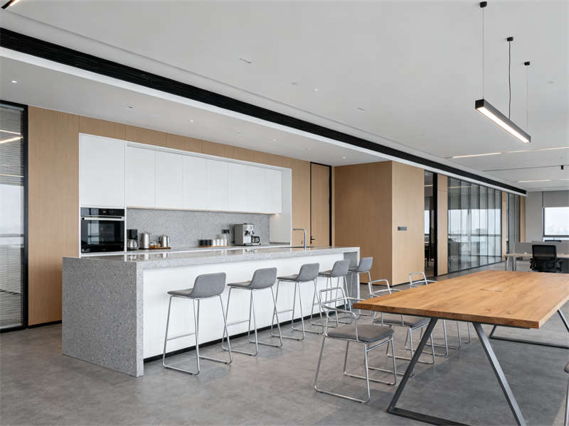 中型會議室圍繞協(xié)作功能展開,長條式會議桌與玻璃隔斷搭配,既保證空間開闊,又能與外部辦公區(qū)形成視覺聯(lián)動,灰色布藝座椅與頂部圓形吊燈呼應(yīng),讓會議場景兼具功能性與舒適感。茶水間則通過淺灰石英石臺面、木色護(hù)墻板與暖光燈帶,營造輕松休閑的氛圍,成為辦公間隙的放松節(jié)點(diǎn)。