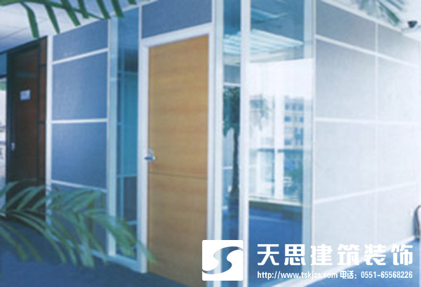 從專業(yè)角度來講玻璃隔斷墻因稱為透光模塊隔斷墻,玻璃隔斷中又分單面邊置、單面中置、雙面、雙面帶橫檔、雙面內(nèi)置百葉簾等多種方式。在玻璃隔斷墻的安裝中,安徽天思建筑辦公室裝修設(shè)計公司考慮到使用功能的不同,做如下設(shè)計建議: