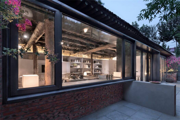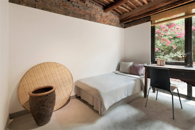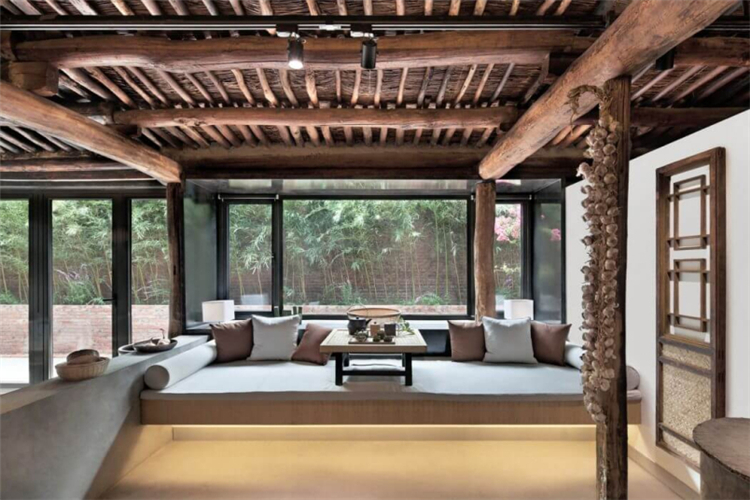 而我們在這次的民宿的功能布局方面,我們根據(jù)與居民的詳細(xì)溝通,了解他們的日常生活和習(xí)慣,進行調(diào)整,重新組織平面圖。在我們拆除吊頂后,更多的空間被釋放,原始的木結(jié)構(gòu)和稻草覆蓋的天花板紋理終于顯露出來,講述了一個時間的故事。在現(xiàn)場勘察過程中,我們在建筑物西側(cè)和鄰近墻壁之間發(fā)現(xiàn)了一條約80厘米寬的狹窄通道。因此,我們在走廊盡頭向西側(cè)設(shè)計了一個觀景窗。在窗外,擺動的竹影有助于將室內(nèi)空間與自然環(huán)境相連。