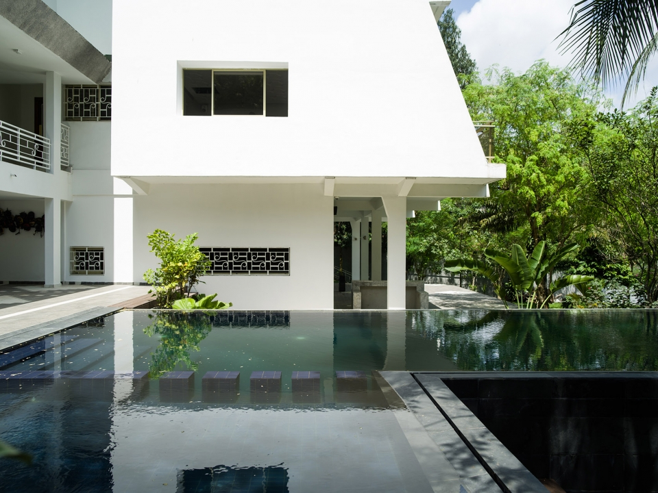 酒店外觀局部,建筑在泳池中投下倒影,部分外部視圖,池反射建筑物。健身房和養(yǎng)生區(qū)位于原建筑的廚房處,擁有良好的自然通風(fēng)以及朝向。游泳池又長(zhǎng)又窄,客人們可以在其中進(jìn)行來(lái)回往復(fù)式的游泳運(yùn)動(dòng),同時(shí)還在炎炎夏日里為客人們提供了一個(gè)消暑空間,當(dāng)?shù)貥淠镜娜~子和開(kāi)花植物則為泳池空間提供了遮陰處和裝飾。