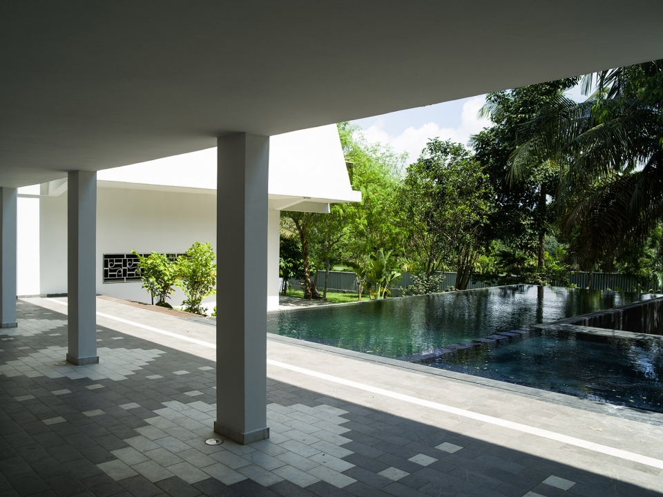 站在走廊上看泳池,室外狹長(zhǎng)的泳池,棕櫚樹蔭提供了遮陽(yáng)空間?;▓@也充滿了自然的意趣,給人一種放松之感,建筑師還在花園的地面上鋪設(shè)了新的灰白兩色圖案的地板,不僅在室外空間中創(chuàng)造了一種視覺(jué)聯(lián)系,更是將室外空間統(tǒng)一了起來(lái)。