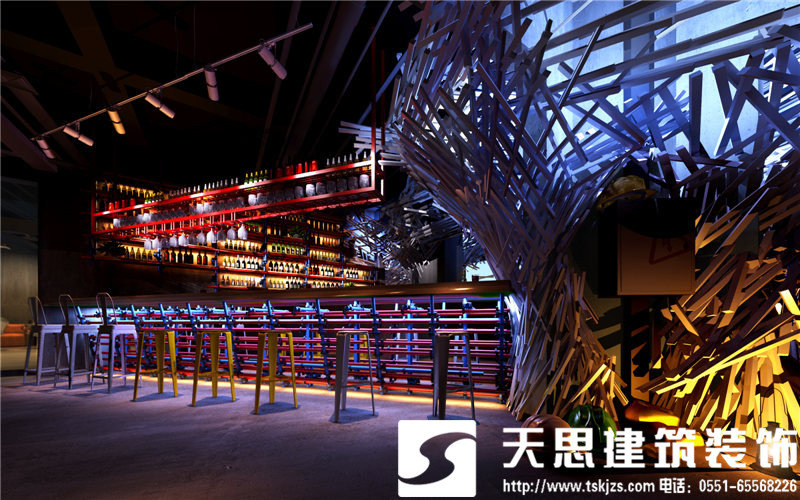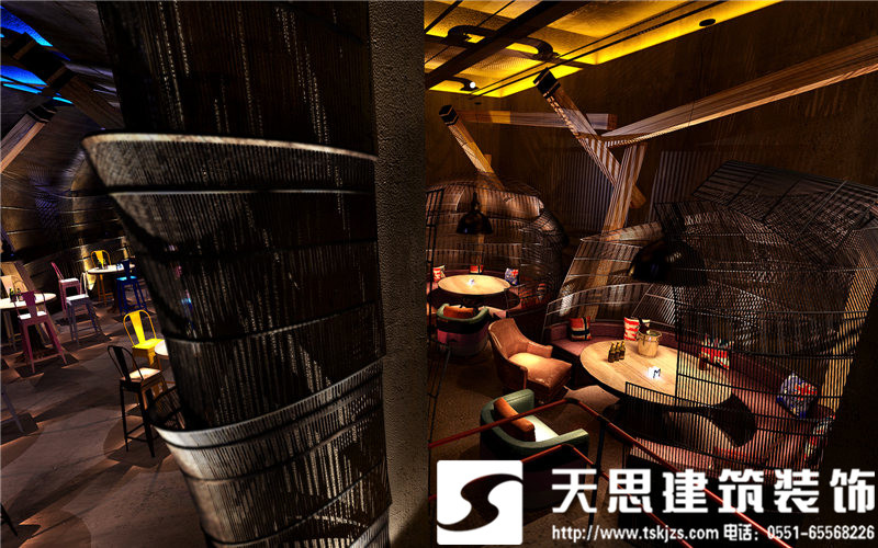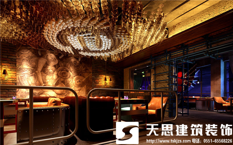一層吧臺(tái)處,方鋼構(gòu)建的造型樹自由,飄逸,充滿藝術(shù)張力。鋁制吧臺(tái)搭配特制的建筑腳手架座椅,工業(yè)范兒十足,還原了建筑的純粹美感。鋼板樓梯處用射燈做呼應(yīng),浪漫且工業(yè)氣息濃郁。通道處,玫瑰金鋼板勾勒的點(diǎn)點(diǎn)星光自由浪漫,展現(xiàn)了工業(yè)元素的獨(dú)有魅力。包間,原有紅磚墻處理后的墻面中性硬朗,鐵網(wǎng)做成的遮擋裝飾飄逸自由,營(yíng)造的私密效果恰到好處。玻璃上的手繪勾勒出包間裝飾畫,讓視角多了一絲抽象派的趣味。