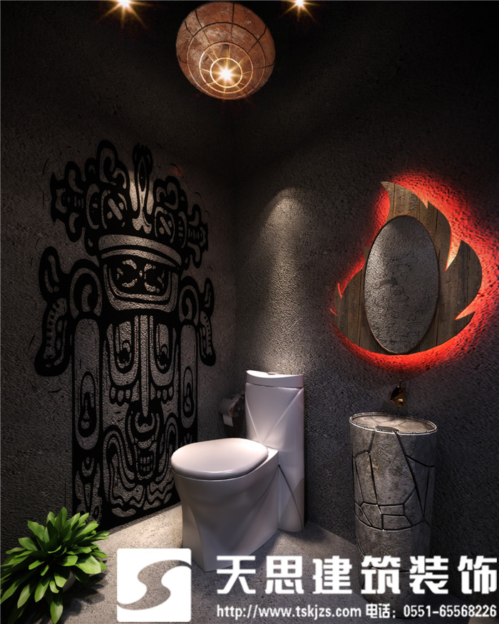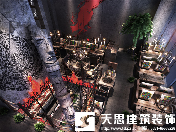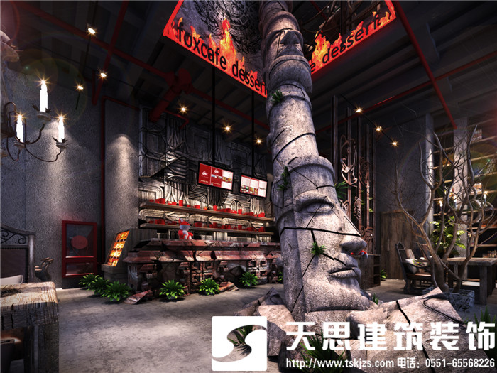 此案運(yùn)用破碎的瑪雅建筑紋理作為主元素貫穿整體空間設(shè)計(jì),將消失的瑪雅文化融入到設(shè)計(jì)風(fēng)格里,用藝術(shù)化自然化的設(shè)計(jì)手法將簡(jiǎn)陋的空間置換為國(guó)際潮流空間設(shè)計(jì)風(fēng)尚。僅用一根從底層直穿二樓的人面雕塑就巧妙規(guī)避了空間的局促感,成為整體空間設(shè)計(jì)最凝練的一筆。整體空間基調(diào)沉穩(wěn),清水混凝土、石頭以及原木都為統(tǒng)一的暗色系,為了突出火狐的特色,將紅色引入空間,不僅活躍了空間,也讓品牌形象悄然流露。