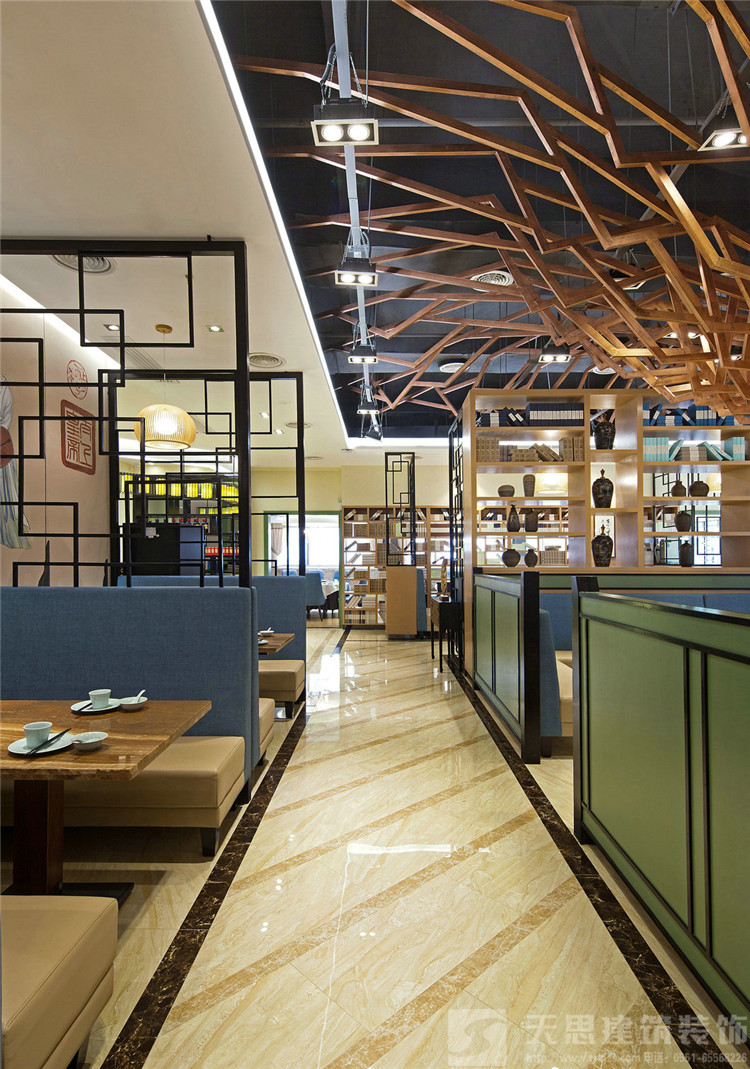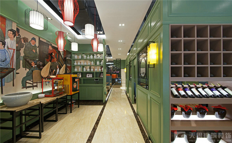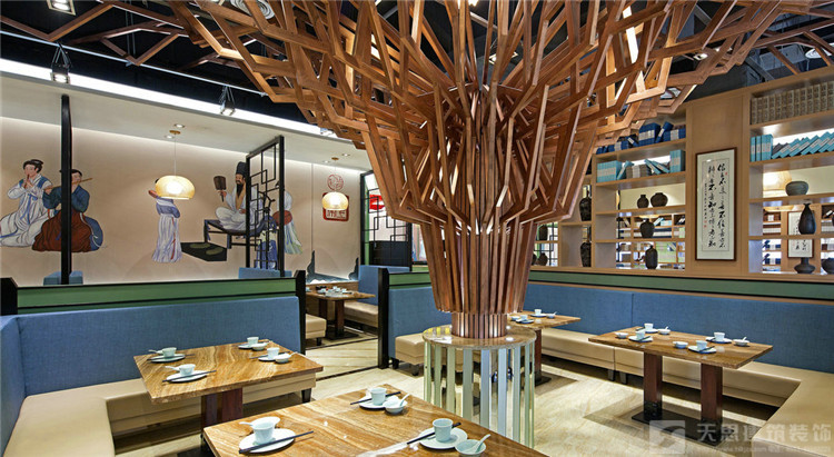 夜宴餐廳以五代十國時南唐畫家顧閎中的作品《韓熙載夜宴圖》為創(chuàng)作靈感來源,通過“聽彈琵琶”,“集體觀舞”,“中間休息”,“各自賞月”。“依依惜別”,等五個章節(jié)來還原當時的盛況,通過畫中設計元素提煉,及色彩的組合,達到客戶用餐的體驗感。
