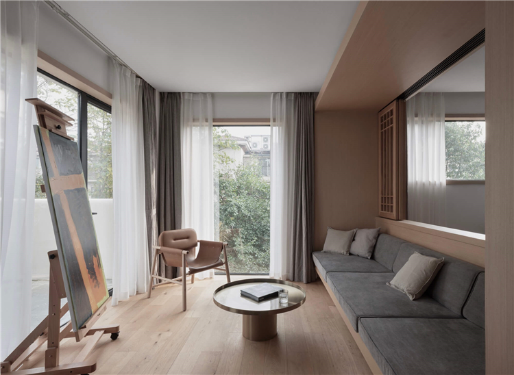 設(shè)計師針對民宿的入住功能一共設(shè)計了八間不同布置風(fēng)格的客房,將入住功能布置與二三四層,重新規(guī)劃房間平面,擴(kuò)大每一個房間的衛(wèi)生間,增加落地窗,以此增加舒適度,同時為入住的客人創(chuàng)造趣味性的體驗。在每一層中間以中島作為過渡,對應(yīng)每一個房間,即協(xié)調(diào)客房的動線關(guān)系,又給每一位入客人提供便捷的交流空間。