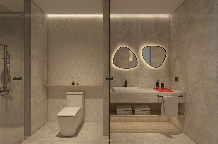 設(shè)計(jì)師遵循原有的管道設(shè)計(jì),通過半堵實(shí)用的功能墻,將洗浴間和馬桶間劃分,在隱形了五金件和儲(chǔ)物歸納后,化繁為簡(jiǎn)被得到了充分的運(yùn)用,就連回風(fēng)口也被巧妙的融入在燈帶里.