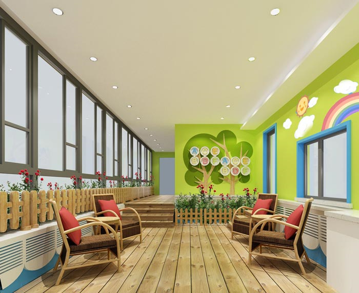 休息區(qū)域的設計:此處不僅可供教師休息,同時也可供孩子們在這里玩耍、娛樂,設計師的目的就是想讓大家在這里可以感受到陽光的溫暖,在此處陽光滲透到每一處空間,設計師希望陽光、自然可以掃清教師心中的煩躁,同時也給孩子更多的溫暖。
