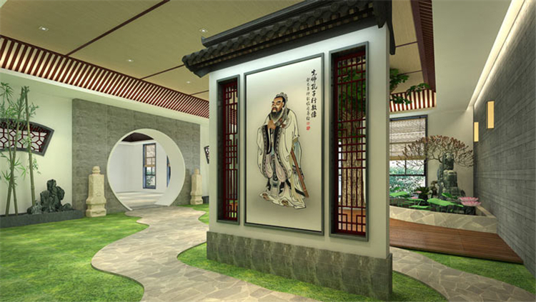書(shū)法教育培訓(xùn)機(jī)構(gòu)進(jìn)門(mén)區(qū)設(shè)計(jì):文化的脈絡(luò)是字體,字體的脈絡(luò)是書(shū)法,書(shū)法的脈絡(luò)中隱藏著傳統(tǒng)的中華文化,通過(guò)對(duì)字體書(shū)法的研究,進(jìn)入傳統(tǒng)文化的世界。至圣先師的畫(huà)像佇立在庭院的正中央,為空間增添了莊重之感,自然的景色更顯書(shū)法的飄逸與自然。