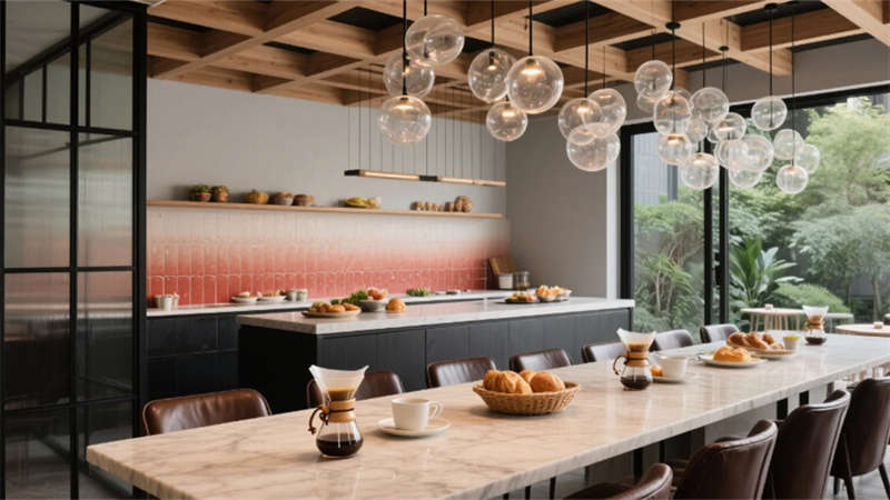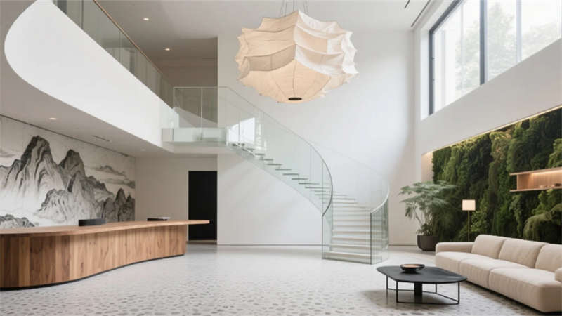 步入挑高的大堂,原木與石材的碰撞詮釋著質(zhì)樸的高級感。懸浮玻璃樓梯如透明絲帶盤旋而上,紙藝褶皺吊燈灑下柔和光暈,綠植墻在隱藏式燈光中若隱若現(xiàn),仿若一幅當代山水畫卷??头恳耘遗c米白為基調(diào),亞麻、微水泥與天然木紋織就療愈氛圍,弧形沙發(fā)與嵌入式燈帶讓空間流動著溫柔詩意,落地窗將城市天際線化為朦朧背景。