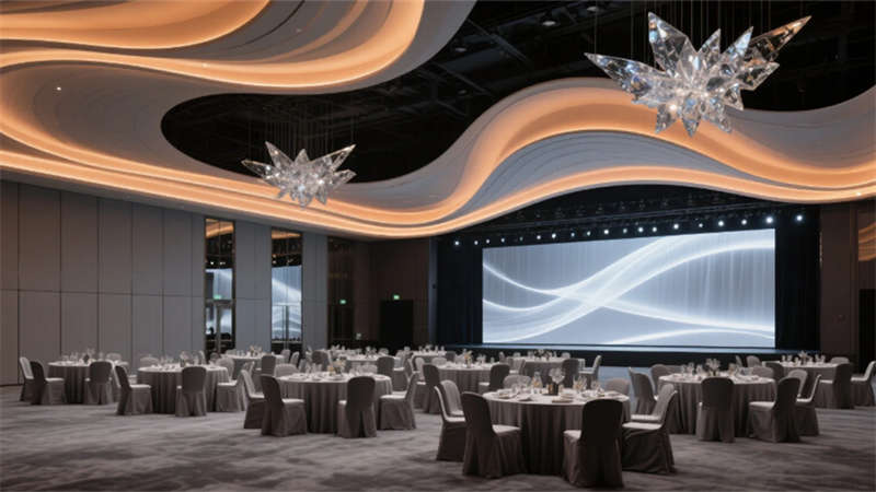 全日餐廳以陶土色格柵天花呼應徽州傳統(tǒng)工藝,吹制玻璃吊燈如晨露凝結(jié)空中;宴會廳則化身未來劇場,波浪形織物天花與全息投影幕布共舞光影。行政樓層的商務休息區(qū),深灰毛氈墻面與古銅金屬細節(jié)沉淀出理性優(yōu)雅,窗外綠意透過玻璃隔斷滲入交談空間。從屋頂無邊泳池俯瞰,建筑與巢湖的瀲滟水色遙相呼應,于繁華處開辟一方隱逸凈土——這里不僅是居所,更是一場喚醒感官的設計敘事。