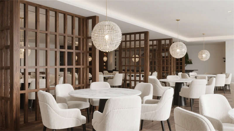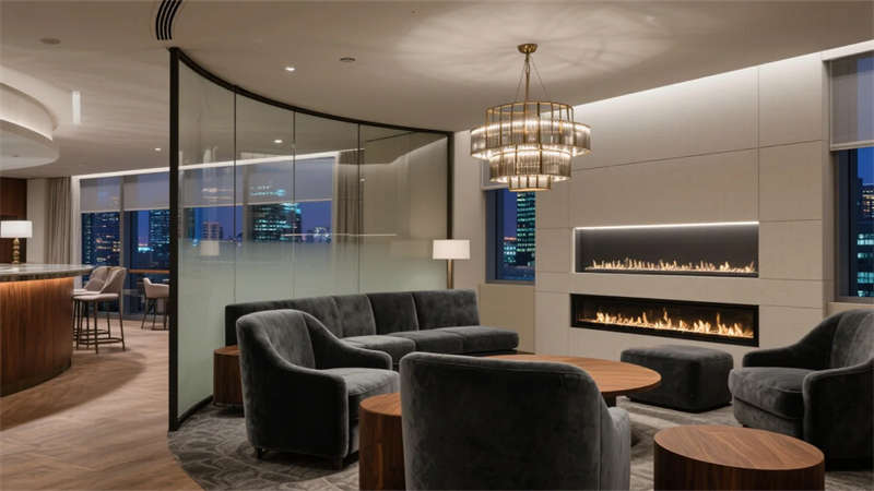 公共空間注重功能與美學(xué)的平衡。行政酒廊通過弧形玻璃劃分動靜區(qū)域,嵌入式壁爐跳動的火焰軟化商務(wù)空間的冷峻感;多功能會議室采用可變形家具系統(tǒng),胡桃木飾面墻與線性燈光共同構(gòu)建專注場域;全日餐廳以開放式廚房為舞臺,球形吊燈在巖板餐桌上投下溫暖光暈,激發(fā)商務(wù)社交的愉悅可能。