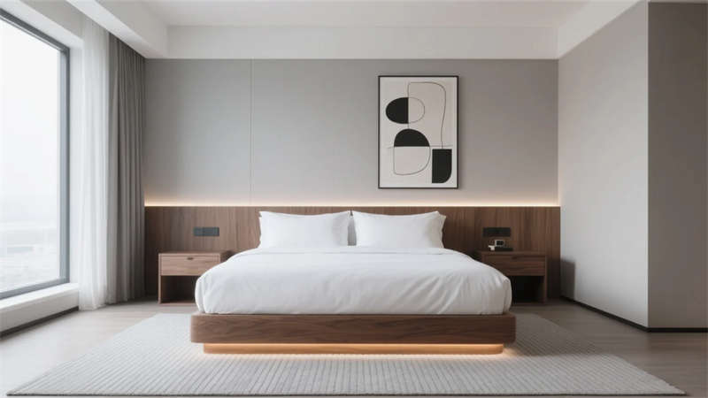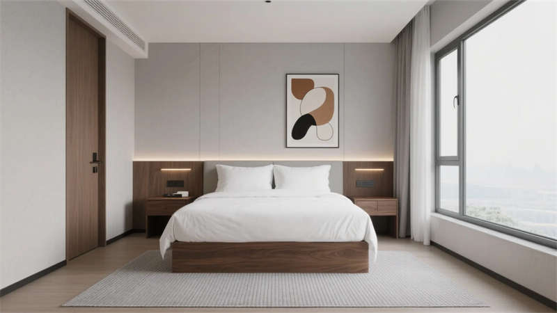 這個商務(wù)酒店的設(shè)計以現(xiàn)代簡約美學(xué)重構(gòu)城市商旅空間。設(shè)計摒棄繁復(fù)裝飾,運用暖灰與胡桃木的主色調(diào)營造溫潤氛圍,香檳金金屬細(xì)節(jié)勾勒精致輪廓,在理性秩序中注入藝術(shù)溫度。