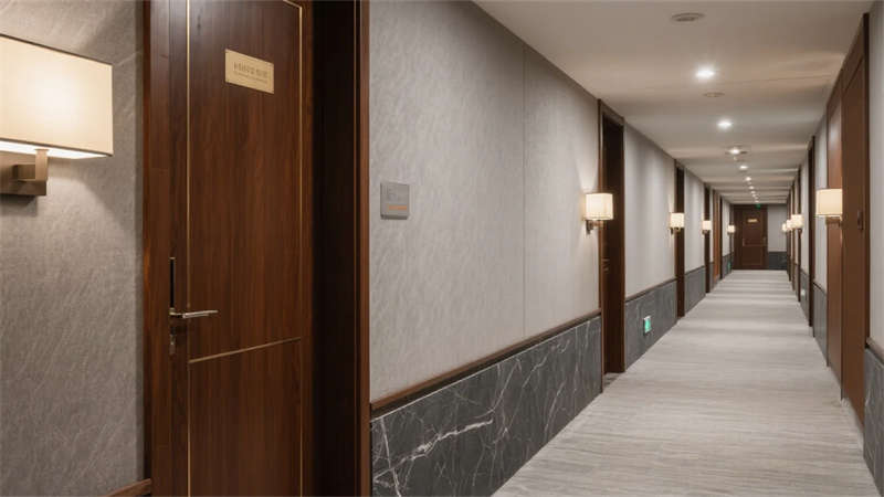 健康關(guān)懷滲透于細(xì)節(jié)設(shè)計中。健身房落地窗最大化引入自然景觀,橡膠地面與鏡面墻體形成虛實對話;電梯廳香檳金轎廂與石材墻面碰撞出質(zhì)感層次,每處轉(zhuǎn)角皆設(shè)置藝術(shù)端景,讓行進(jìn)過程成為美學(xué)巡禮。走廊絨面墻體的細(xì)膩觸感消解了通道的單調(diào)性,精心計算的燈光角度引導(dǎo)賓客自然抵達(dá)目的地。