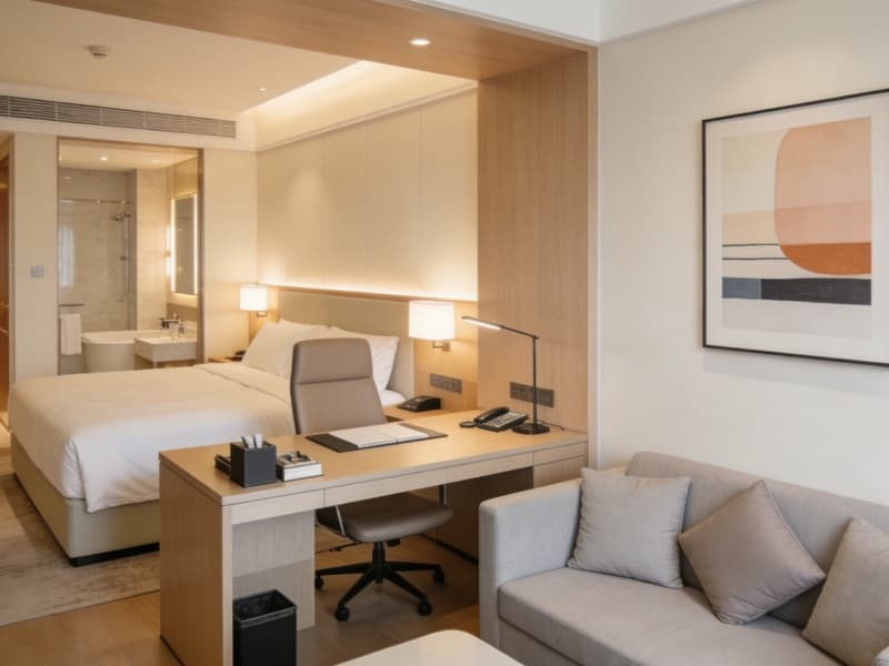 二至四層為住宿層,規(guī)劃約80間客房,包括豪華房、行政房等房型??头恳詼\木色為主調(diào),搭配真皮軟裝與柔和燈光,營造溫馨氛圍。每間客房均配備智能客控系統(tǒng),方便客人操作。