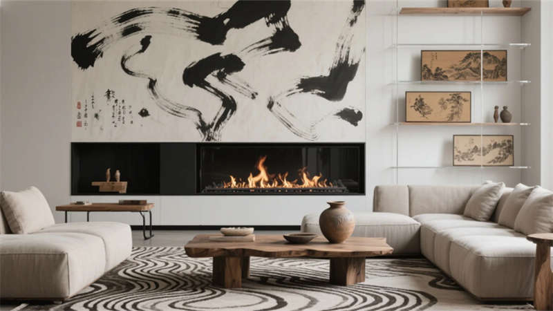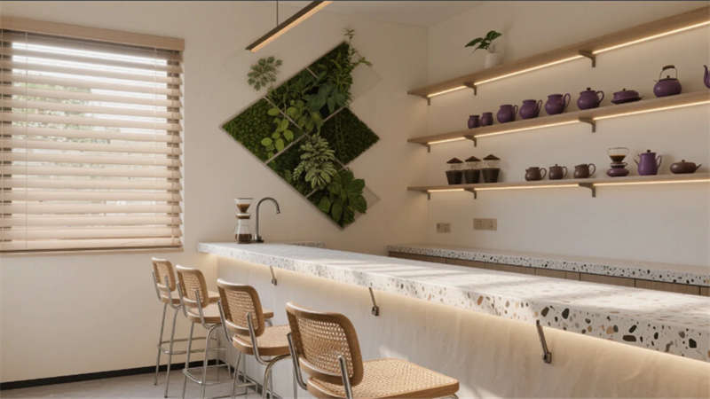步入大廳,弧形亞麻沙發(fā)與編織地毯圍合出松弛場域,整面落地窗借景庭院竹影,琴葉榕與懸浮綠植墻形成立體生態(tài)敘事。多功能區(qū)以巢湖水波紋地毯呼應(yīng)地域脈絡(luò),壁爐旁的非遺火筆畫裝置暗藏城市文化密碼??Х劝商倬幾闻c水磨石臺(tái)面碰撞,幾何綠植墻在百葉光影中演繹晨昏詩意。