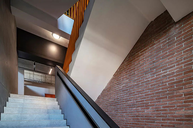 室內(nèi)空間造型多以棱角分明的幾何形體為主,減少裝飾類(lèi)細(xì)部,鐵銹褐、水泥灰、煙熏黑等暗冷色調(diào)元素交織在一起。局部通過(guò)紅磚作為點(diǎn)綴,減少淺色系材質(zhì)的使用,讓自然光線將空間變得更有質(zhì)感。