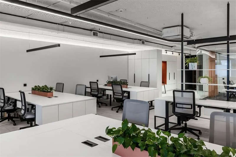 淺灰色的頂面與地面,配以白色墻體和主體辦公家具,再輔以縝密的燈光照明,讓室內呈現明亮純凈的光彩質感;黑色線性元素的加入豐富了空間構成和視覺趣味性;唯一的暖棕色彩的點綴讓空間更靈動更富有層次感,也為純凈極簡的空間帶去一抹溫暖氣息。