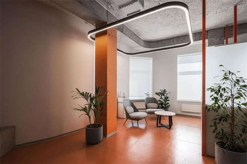 一種是沿辦公室周邊設置了一圈燈帶,燈光從白色天花板上反射出來,散發(fā)出令人賞心悅目的溫暖漫射光。還有一種線性照明形式呼應流線型的建筑輪廓,將整個辦公室從入口區(qū)域連接到行政工作區(qū)。另一個這樣的設計元素出現在廚房區(qū),當陰天自然光不足時可以照亮這里的空間。此外,每組工位都有一個獨立光源,如有必要,每個員工都可以自行打開或關閉。