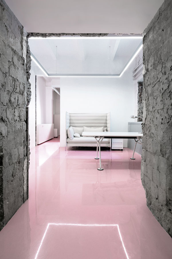 下面這個(gè)粉嫩嫩的辦公空間是NGRS獵頭公司位于莫斯科市中心的總部,鄰近紅場和克里姆林宮。該辦公室室內(nèi)設(shè)計(jì)采用了單一的白色色調(diào),并在地板上大面積的使用了柔和溫馨的粉色。該公司的職員90%是女性,這個(gè)萌發(fā)少女心的色彩方案以及半圓形臺(tái)階及拱門的設(shè)計(jì)得到了職員的一致好評(píng)。