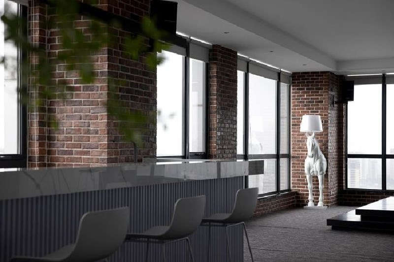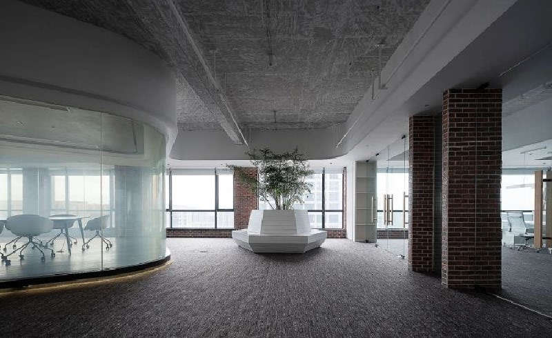 經(jīng)劃分,原本四方的整體空間,大致可歸為公共辦公區(qū)、獨(dú)立辦公室、黨建室、互動區(qū)、財務(wù)室、會議室、儲藏室、休閑室、檔案室及其他功能區(qū)域。拋去濃烈的墨黑,以灰、白作主色調(diào),既保持了沉穩(wěn)、大氣的理智感,又不使氣氛過于肅靜。前臺加入金色提亮,搭配大理石的紋理質(zhì)感,活波間亦不落俗,凈土之上雅致盡顯。在簡約現(xiàn)代的輕工業(yè)氛圍下,色彩、裝飾往往點(diǎn)到為止。紅磚墻與藤編椅的原生感,質(zhì)樸、不造作,在一片素雅的環(huán)境中,如曇花輕綻,為空間注入悄無聲息的生命力。