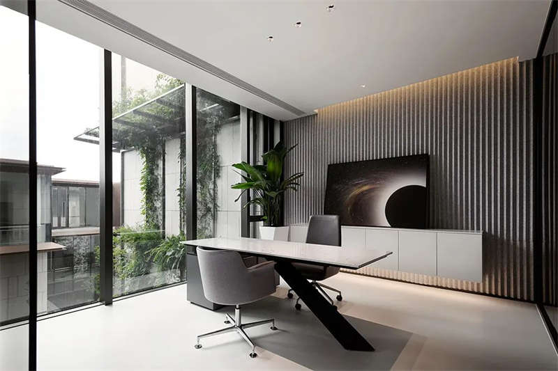 建筑是凝固的音樂,音樂是流動(dòng)的建筑。二、三層分別是開敞式辦公和高管辦公區(qū),空間整體黑白分明、線條硬朗,像是鋼琴的黑白鍵,揮灑自如,動(dòng)人的旋律,或悠揚(yáng)或激昂。