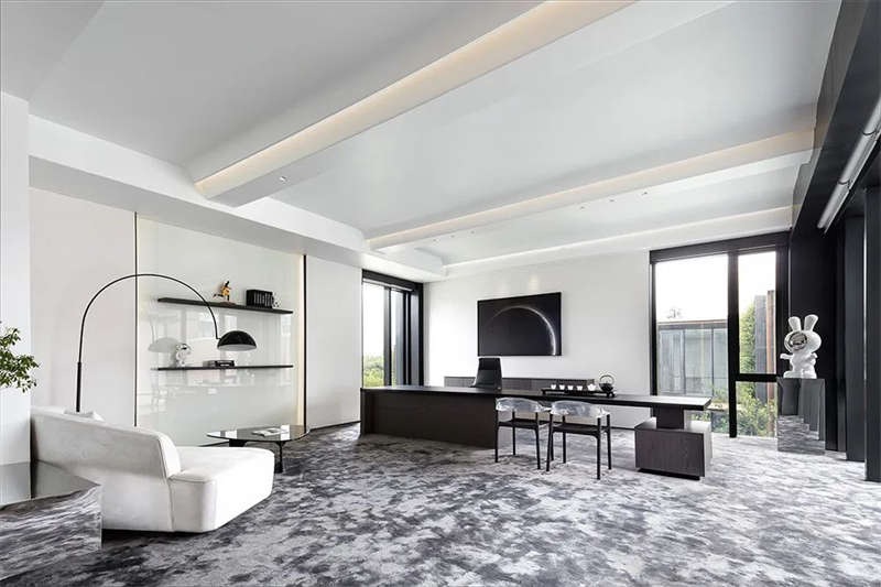 一層前臺(tái),以黑白創(chuàng)作出一個(gè)極致簡(jiǎn)潔的空間,兩側(cè)落地開窗實(shí)現(xiàn)無限延伸,空間的邊界更加柔軟,內(nèi)庭院成為接待區(qū)的裝飾景觀,前臺(tái)及背景以“帆”這一意象表達(dá)對(duì)于宇宙世界探索的起航。樹脂地坪的無接縫特性解決了材質(zhì)拼接的繁瑣,讓空間更加純粹簡(jiǎn)潔。