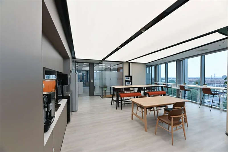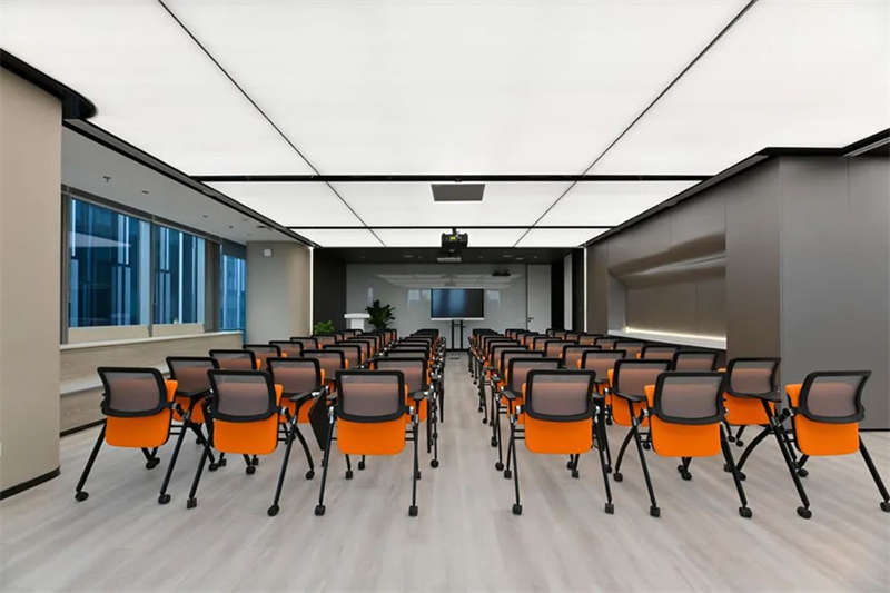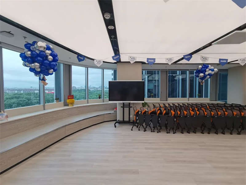 設(shè)計(jì)團(tuán)隊(duì)特意選擇了一處大型開敞的臨窗場(chǎng)地,在酷炫的3D裸眼展示室旁邊打造出了一個(gè)4S店風(fēng)格的培訓(xùn)和茶水的二合一空間,以滿足客戶快速發(fā)展的團(tuán)隊(duì)培訓(xùn)和新品發(fā)布的需求。在臨幕墻的位置,設(shè)計(jì)師原來就設(shè)計(jì)了一排沿窗的休閑階梯造型臺(tái)階,后來因?yàn)橐咔榉揽氐男枨?,把臺(tái)階內(nèi)的空間利用好,平時(shí)內(nèi)部可以儲(chǔ)藏睡袋,防疫物資,帳篷等物品。