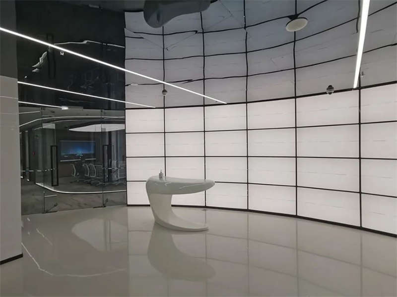 在電梯出來,一步入半圓弧的接待前廳,馬上看到的是以安全氣囊元素為主創(chuàng)意的,帶燈光變化的半弧造型墻,時(shí)尚大氣。在這純粹的黑白灰空間里,一個(gè)純白色飛馳動(dòng)感造型的前臺(tái)安安靜靜的擺設(shè)在那,在不使用的時(shí)候,它也是一個(gè)時(shí)尚的藝術(shù)品。和背鏡墻相結(jié)合,體現(xiàn)了速度與安全的設(shè)計(jì)理念。