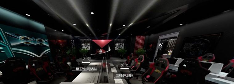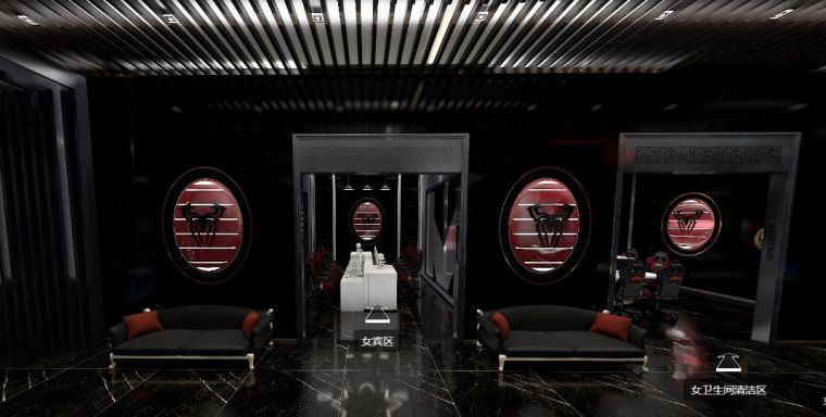 在迎賓區(qū)兩邊,左右分布著男賓區(qū)和女賓區(qū)。相較于普通網(wǎng)咖設(shè)計(jì),電競(jìng)會(huì)館具有賽事承辦上的專業(yè)特色,為了使人更加有比賽所需專注,男賓區(qū)墻面只有簡(jiǎn)單的涂鴉,飾物元素也極少,相較于男賓區(qū)設(shè)計(jì)較為簡(jiǎn)單,女賓區(qū)“紅蜘蛛”主題感十足,頂墻燈光合理搭配來減少黑色來的的壓抑感。男女獨(dú)立衛(wèi)生間分別分布在兩個(gè)區(qū)域,非常人性化。