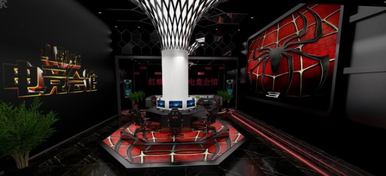 從迎賓區(qū)直接進(jìn)入后,來到最為核心的競(jìng)技比賽區(qū),滿足電競(jìng)游戲里開黑等座位聚集需要,非常創(chuàng)意性地在空間中加入了圓柱設(shè)計(jì),空間里最大亮點(diǎn)是圓柱臺(tái)有規(guī)律交錯(cuò)的線條與“紅蜘蛛”背景墻交相呼應(yīng),打造了成為了“蜘蛛網(wǎng)”的元素,讓整個(gè)核心空間與主題完美契合。