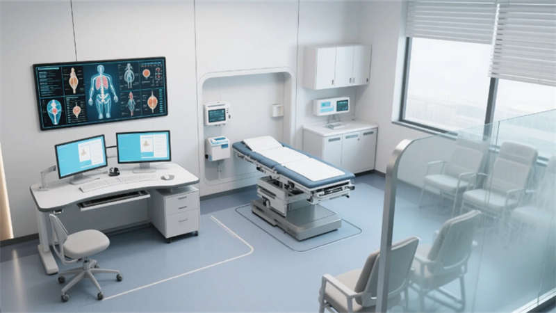 空間以低飽和度灰綠為基調(diào),原生木紋肌理與仿生曲面造型貫穿各區(qū)域,形成視覺連續(xù)性。主入口大廳通過挑空木格柵天花引入模擬天光,曲面導(dǎo)診臺整合智能導(dǎo)航系統(tǒng),落地窗外的療愈庭院模糊室內(nèi)外界限。診室采用霧化玻璃隔斷保障私密性,模塊化醫(yī)療設(shè)備帶與升降診療桌形成靈活工作界面,電子解剖圖譜墻實現(xiàn)醫(yī)患可視化溝通。