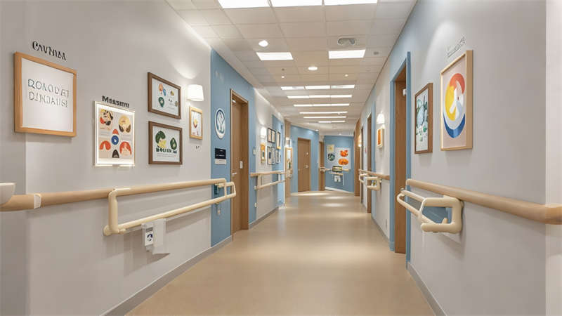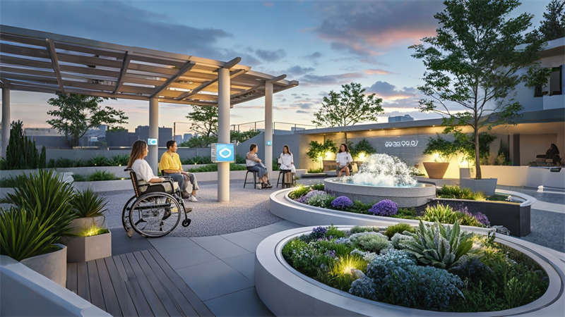 重點區(qū)域采用防滑橡膠地板、圓角處理家具、緊急呼叫裝置等 35 項適老細節(jié),照明系統(tǒng)采用 4000K 暖白光搭配智能調光。醫(yī)療區(qū)設置獨立新風機房,活動區(qū)配置體感互動設備,戶外花園集成霧森降溫和夜光導航系統(tǒng),打造安全、舒適、智能的現(xiàn)代養(yǎng)老空間。