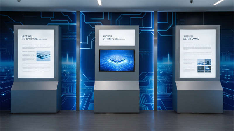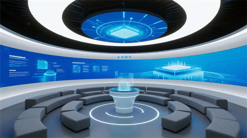 該半導(dǎo)體企業(yè)展廳以現(xiàn)代簡約風(fēng)格為核心,通過流暢空間布局與高科技元素,打造沉浸式科技體驗(yàn)。設(shè)計(jì)突出半導(dǎo)體技術(shù)的抽象表達(dá),利用藍(lán)色與灰色調(diào)營造冷靜、專業(yè)的氛圍,同時(shí)融入玻璃、金屬材質(zhì)增強(qiáng)通透感。入口區(qū)以懸浮雕塑引導(dǎo)視線,產(chǎn)品展示區(qū)通過簡約玻璃柜和觸屏互動(dòng),生動(dòng)呈現(xiàn)技術(shù)精髓;技術(shù)創(chuàng)新墻以動(dòng)態(tài)圖文展現(xiàn)工藝演進(jìn),歷史廊道則以線性敘事喚起行業(yè)記憶?;?dòng)區(qū)和未來展望區(qū)強(qiáng)調(diào)參與性,采用環(huán)形屏幕與全息投影,讓訪客直觀感受創(chuàng)新應(yīng)用。休息區(qū)與演講區(qū)注重人性化,簡約家具結(jié)合微光紋理,提供舒適交流空間。整體設(shè)計(jì)摒棄繁復(fù)裝飾,以干凈線條和光影變化強(qiáng)化空間流動(dòng)性,不僅傳遞半導(dǎo)體領(lǐng)域的精密與前瞻性,更通過美學(xué)融合提升教育性和觀賞性。展廳作為科技展示平臺,旨在激發(fā)探索興趣,體現(xiàn)企業(yè)對創(chuàng)新文化的重視。